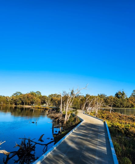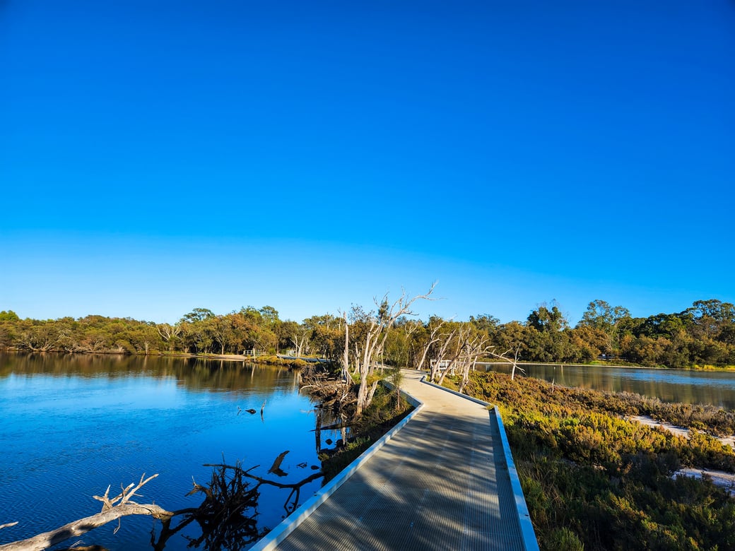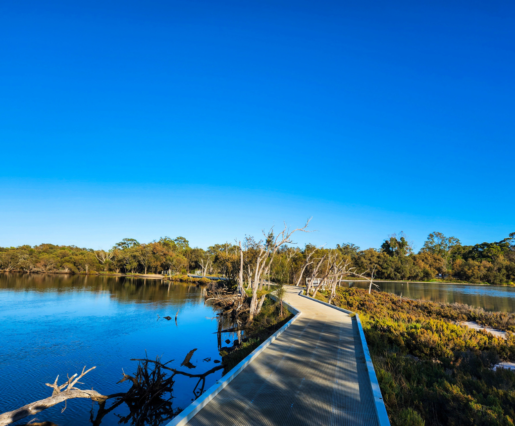 The Joseph and Dulcie Nannup trail is approximately 4km long, flat easy walk with interpretives signage sharing an insight into the cultural history of the Serpentine River. The trail consists of sealed pathways, unsealed compacted limestone and boardwalks. There are multiple entry/exit points to the trail along the waterfront.