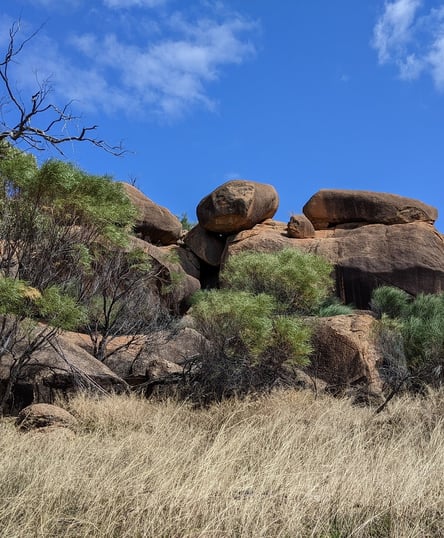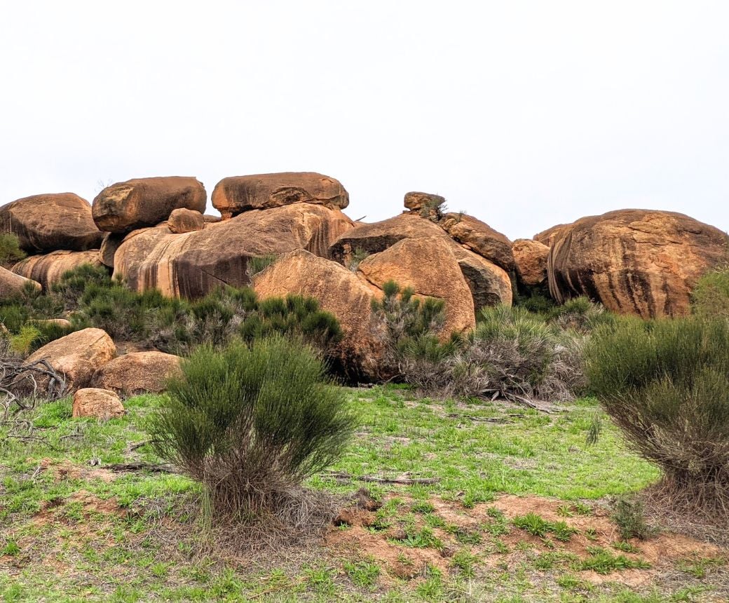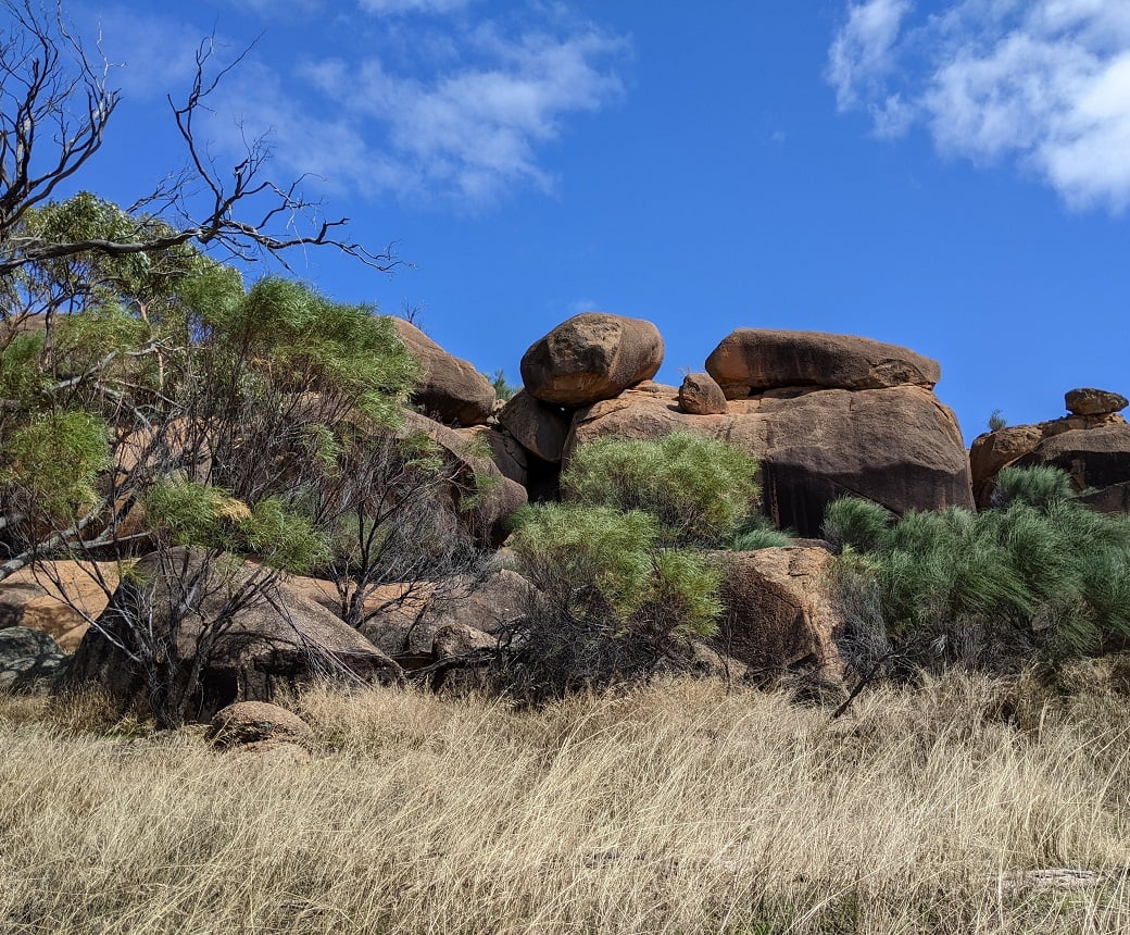 The Kokerbin Rock Circuit starts at the main car park to the east of the giant monolith. From there the trail begins its anti-clockwise circuit of the rock making its way first to the feature wall. A large cliff with texture and colours similar to wave rock caused by erosion. In 400m walkers will be given an option of a short detour to visit a natural amphitheatre, formed on the rocks northeast side. Walking around to the north side, you’ll come across Devil’s Marbles, a large and striking collection of boulders which in the right light can be very attractive.