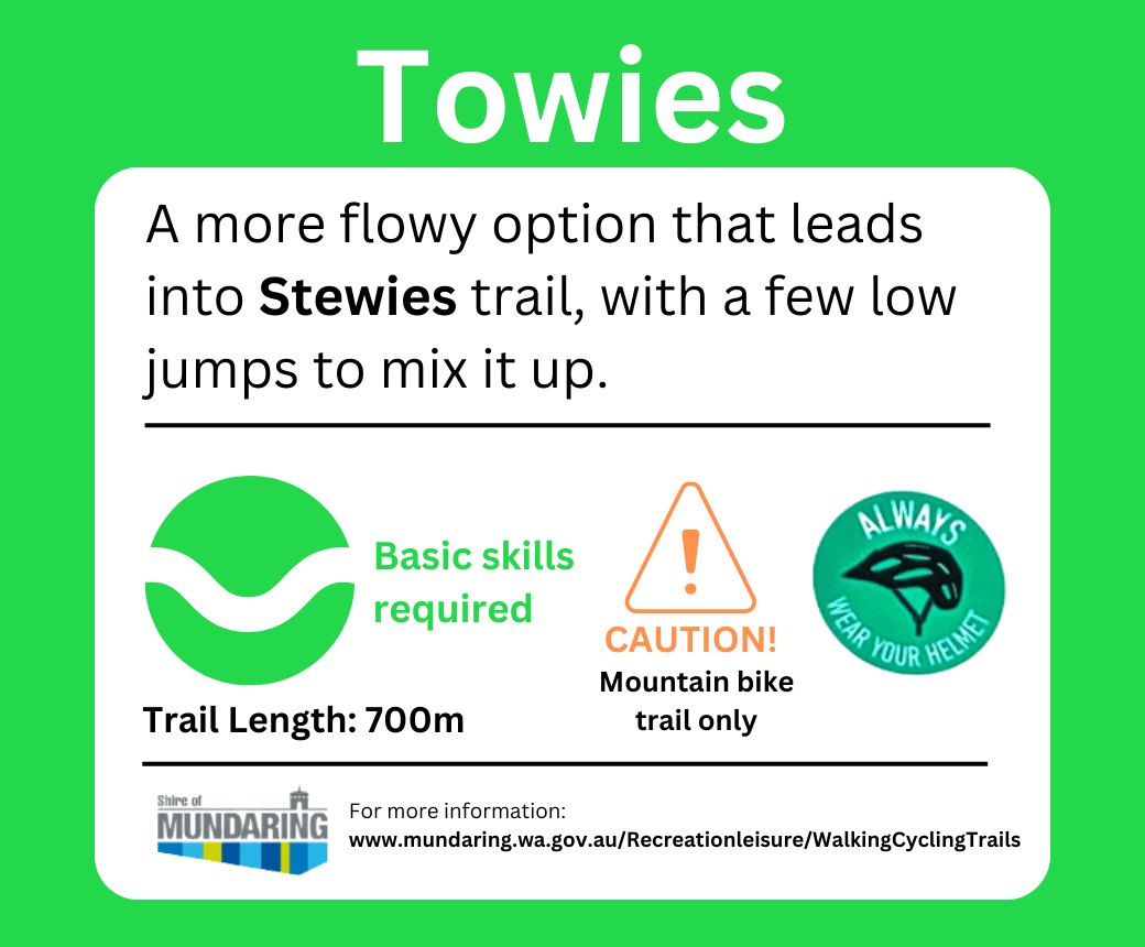 Towies is a smooth, natural green trail that connects to Stewie’s for the bottom half. With some rocks to navigate and easy tabletop jumps, it’s a fun ride that’s a bit more open than Stewie’s, keeping you on your toes as you weave through. Perfect for a laid-back but engaging ride!