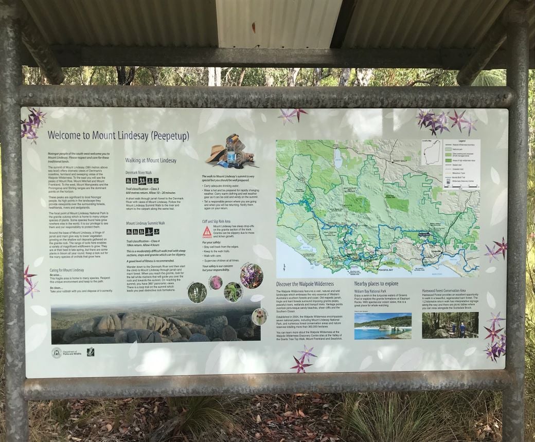 Mt Lindesay picnic area 23km north of Denmark (4.5 hours, 420km south of Perth) along the Mt Lindesay Road.