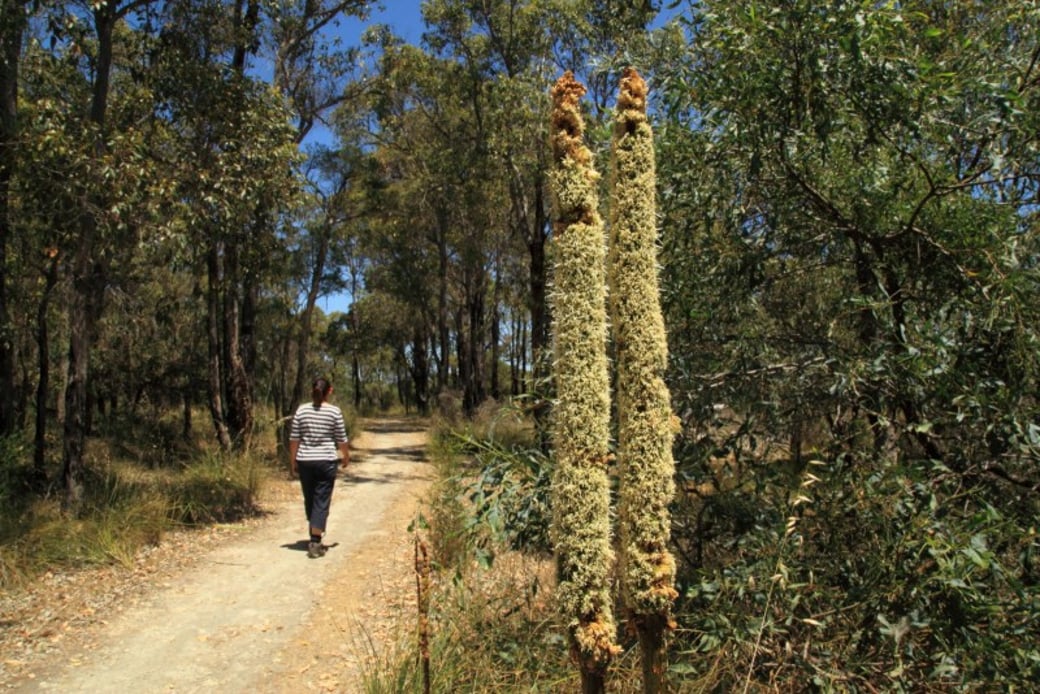 The vegetation is diverse along the trail. Keep an eye for biara, also known as the the slender banksia (Banksia attenuata), jarrah (Eucalyptus marginata), marri (Corymbia calophylla), modong, also known as the stout paperbark (Melaleuca preissiana), swamp banksia (Banksia littoralis), swamp paperbark (Melaleuca rhaphiophylla) and moich, also known as the flooded gum (Eucalyptus rudis).