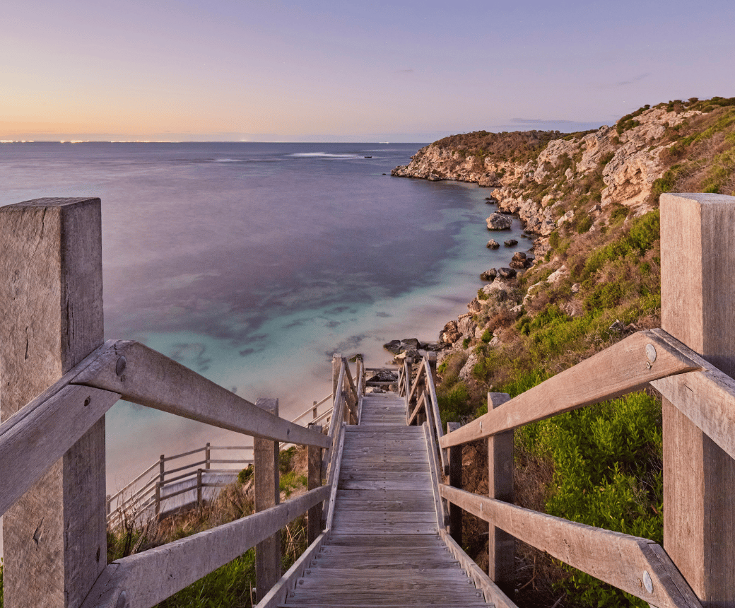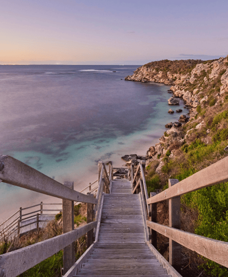 Heading on west, across the Rottnest borefields, you will find yourself at the world class surf break known as 'Strickos', on Strickland Bay. The trail then meanders through the Acacia scrub and pops out on to the craggy limestone shelves along Strickland Bay.